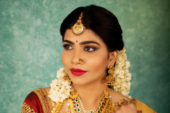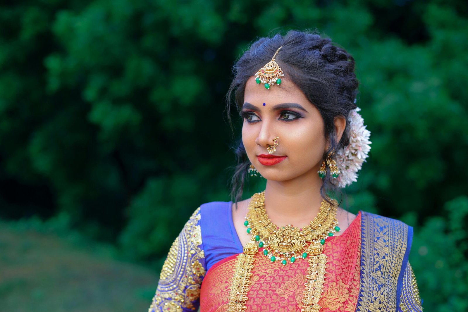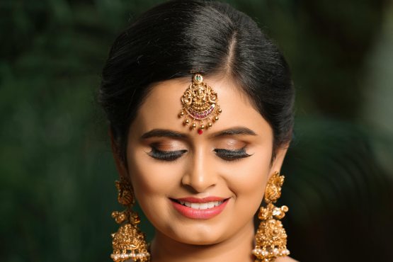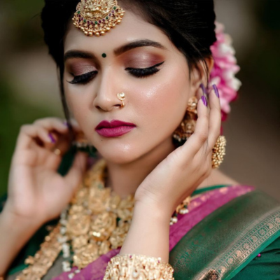 "Traditional South Indian bridal makeup with intricate designs, vibrant colors, and embellishments, reflecting the rich cultural heritage of Bengaluru."